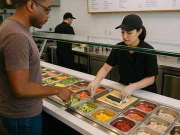 Customer can choose from a selection of fresh proteins, veggies, sauces and toppings
